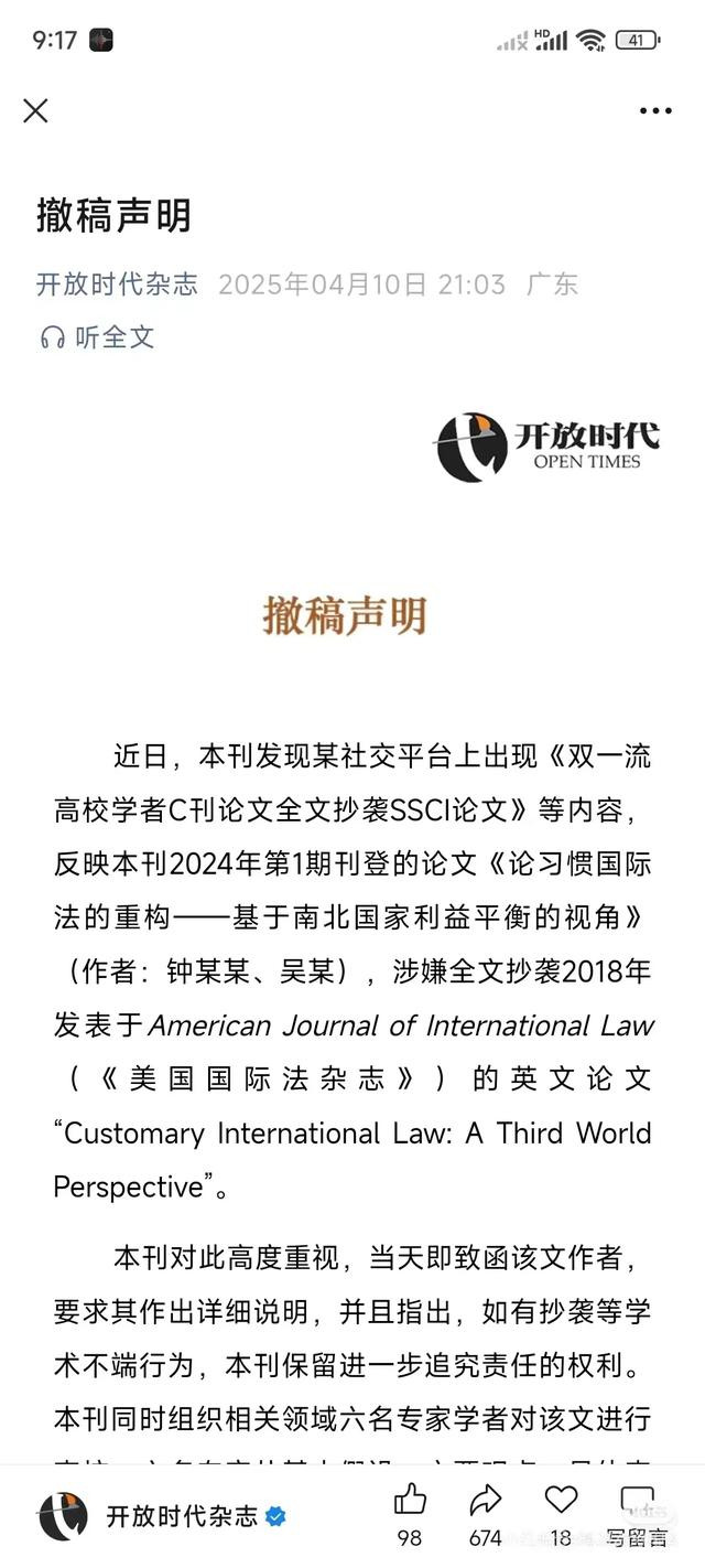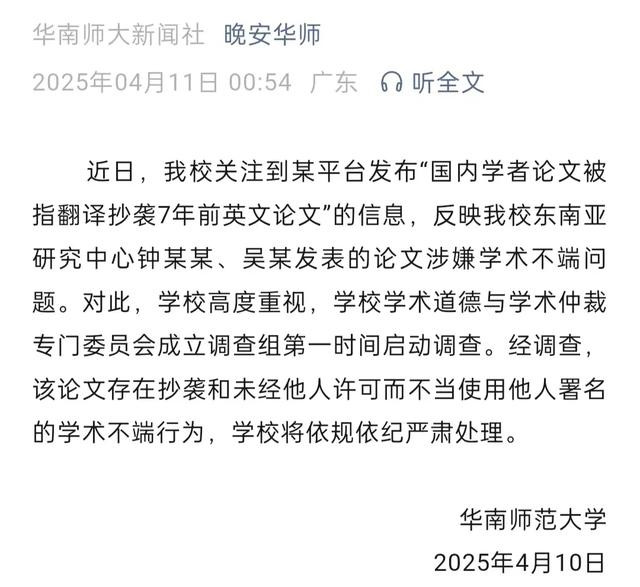 有网友反映华南师范大学钟某某、吴某发表的C刊论文涉及学术不端,完全翻译外文文献。经过审查,华南师范大学做出快速处置,学校依法依规处置。据悉,钟某某为华师大副校长,吴某为东南亚研究中心研究员。C刊也发出撤稿声明。为大家点赞!